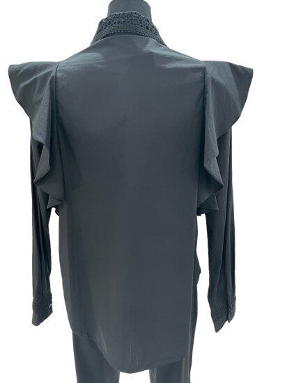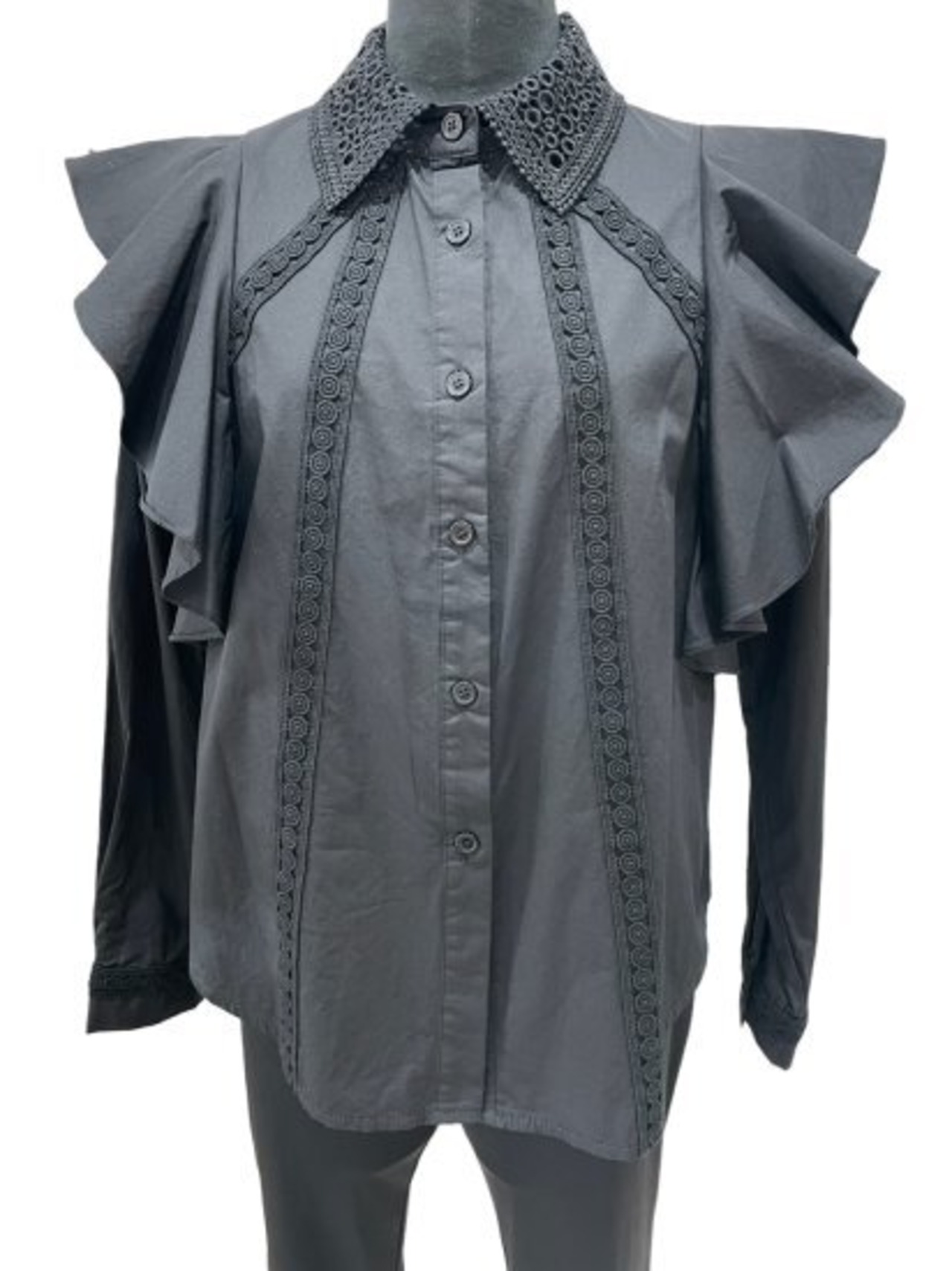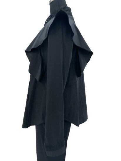可憐なフリルがアクセントのフリルブラウス。身頃には柔らかなコットン素材を使用し、着心地の良さにもこだわりました。さらに、身頃や襟には繊細なレースをあしらい、上品で華やかな印象を演出します。ブラックのカラーは、どんなスタイリングにもマッチする万能アイテムです。カジュアルにもフェミニンにも活躍する一枚ですので、ワードローブに取り入れてみてください。