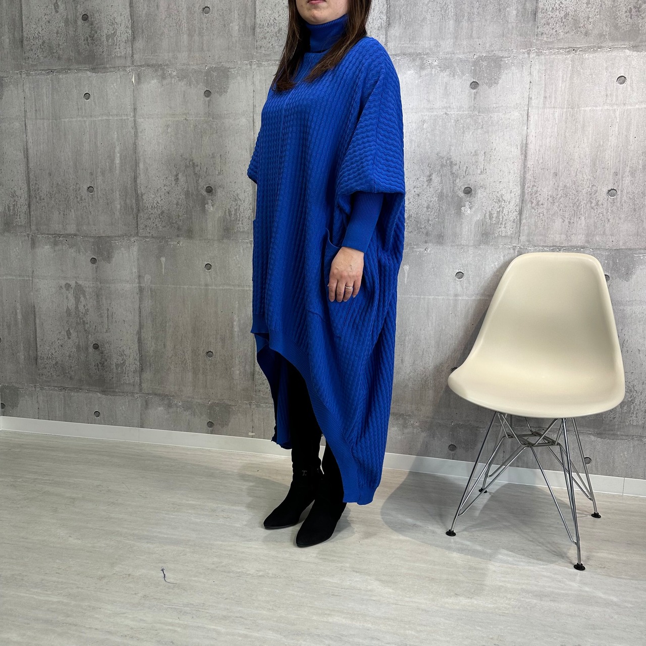 ふわっと優しさを漂わせるボコボコニットワンピース。前部分が短めになっているので、ハイネックでも首元が窮屈になることもありません。袖口は眺めのリブ編みで、手首や手の甲をすっきりと見せてくれます。シンプルなデザインなので、アクセサリーを合わせたり、レイヤードスタイルで着たりするのも楽しくなります。ボリューム感のある生地は暖かく、ふんわりと肌ざわりも心地よいです。冬の季節にぴったりですが、春先や秋口には軽アウターとの相性も抜群です。一枚でおしゃれなコーディネートが完成するハイネックイレヘムニットワンピース、ぜひお試しください。